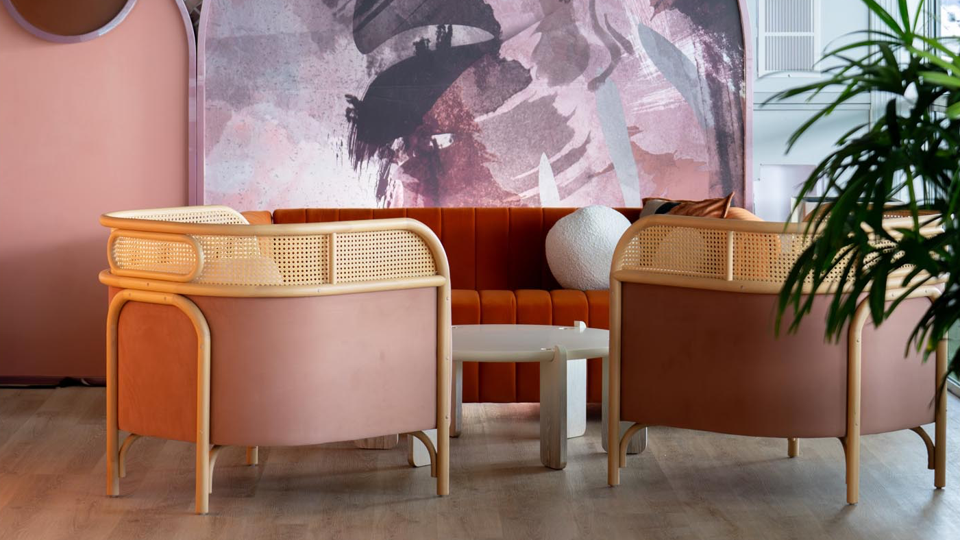 fabric, accented by intricate rattan details. The eclectic mix of