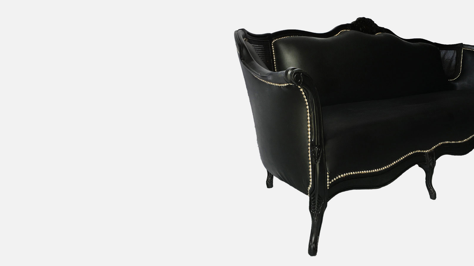 This reinvented Victorianfaux blackleather sofawith matte black frame surrounded bysilver nailheads will be the perfect modern statement to your vintage or eclectic look.